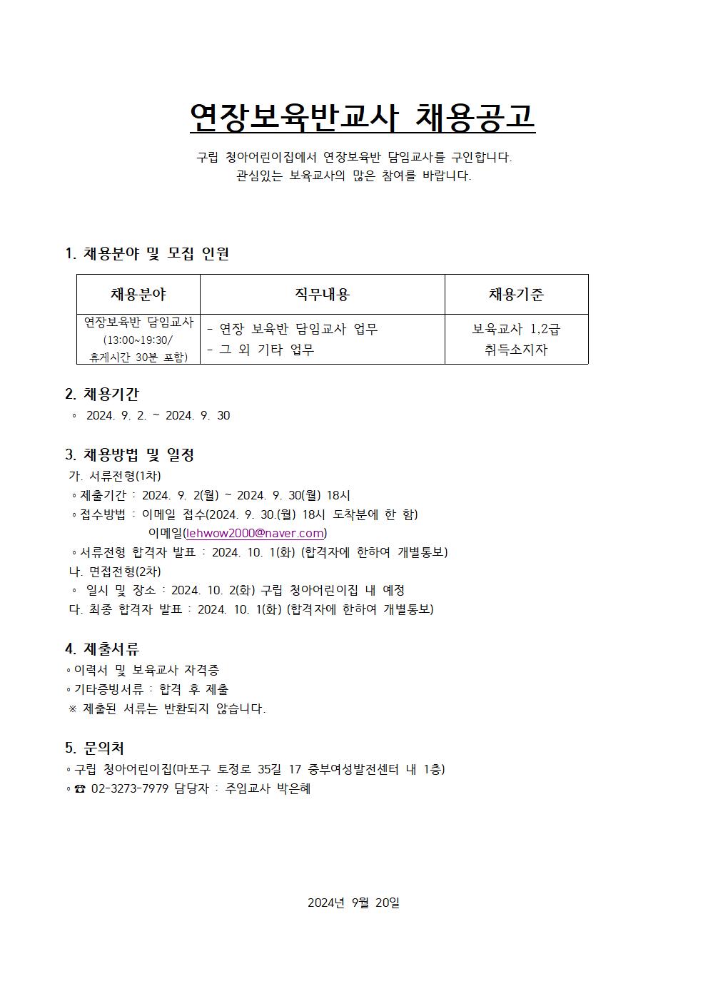 (청아) 마포구립 청아어린이집 영아 연장보육반교사 채용공고